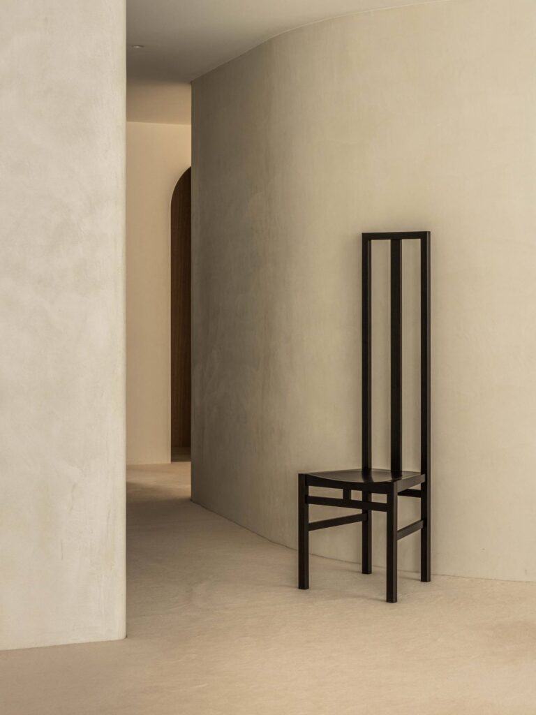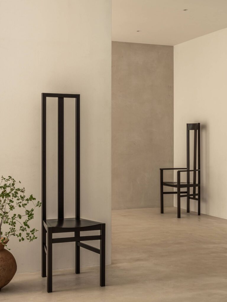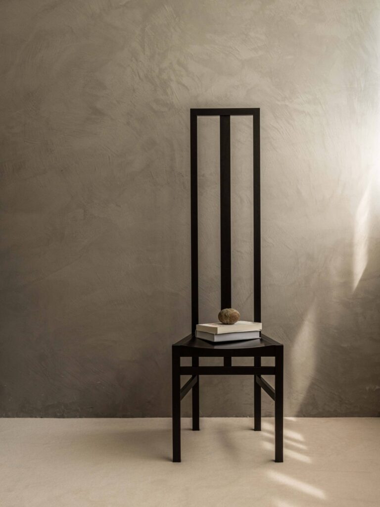 建築家の安藤忠雄が手掛けたアームレスチェア。ウォールナット材という硬質な素材の特性を生かし、背もたれをはじめ、あらゆるディテールにおいてシルエットラインが美しい椅子に仕上がっています。アームレスタイプは背もたれ部分が垂直に立ち上がり、オブジェとしても美しい佇まいを見せます。