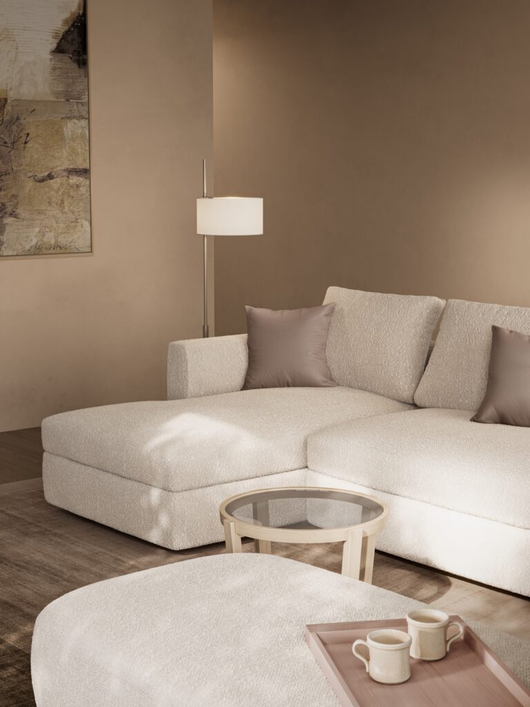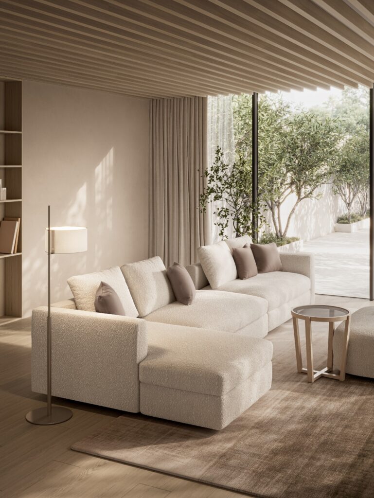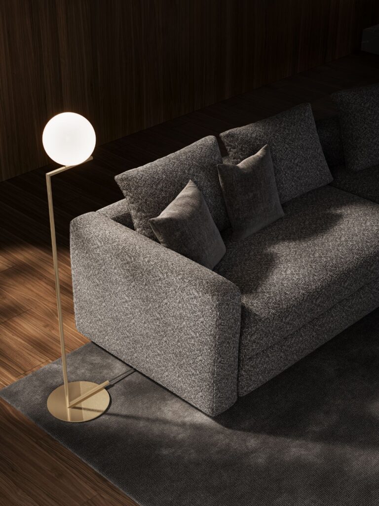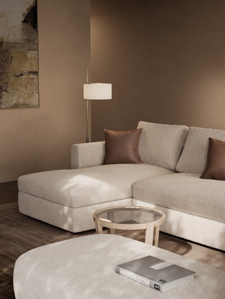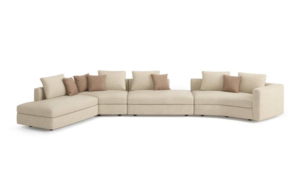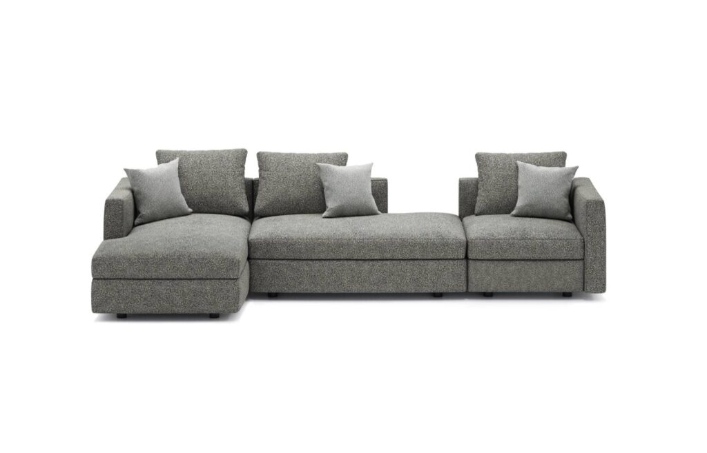 鳥が大空に翼を広げたような、美しい広がりを感じさせるシステムソファです。ストレートやカウチ型のみならず、ゆるやかな角度でレイアウト展開できるモジュールになっています。座る角度や方向も自由で思い思いにくつろぐことができ、新たなつながりをもたらす場所が生まれます。