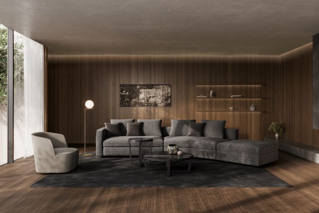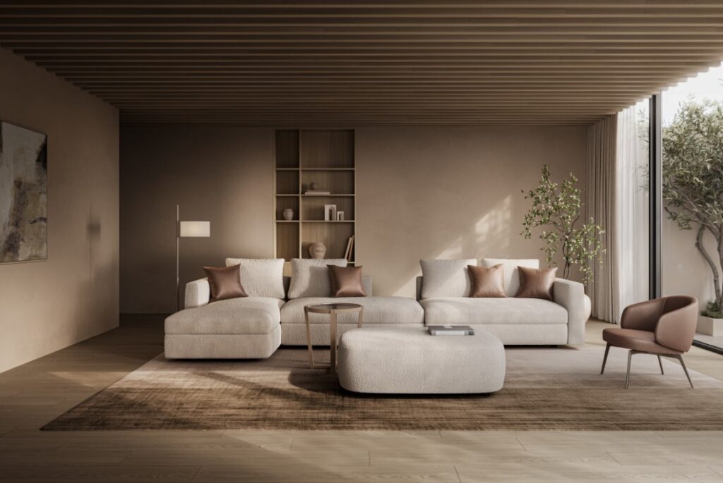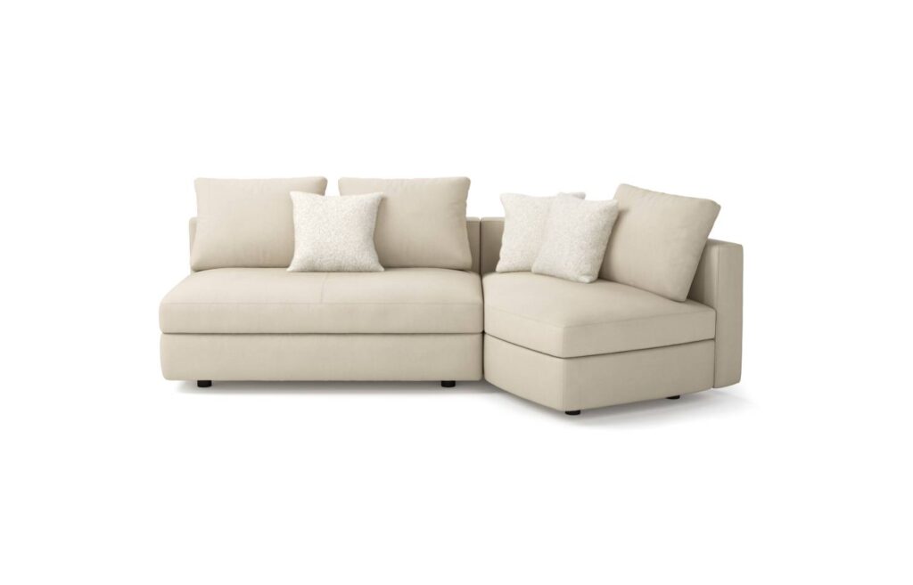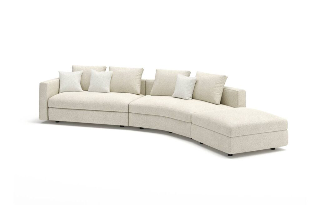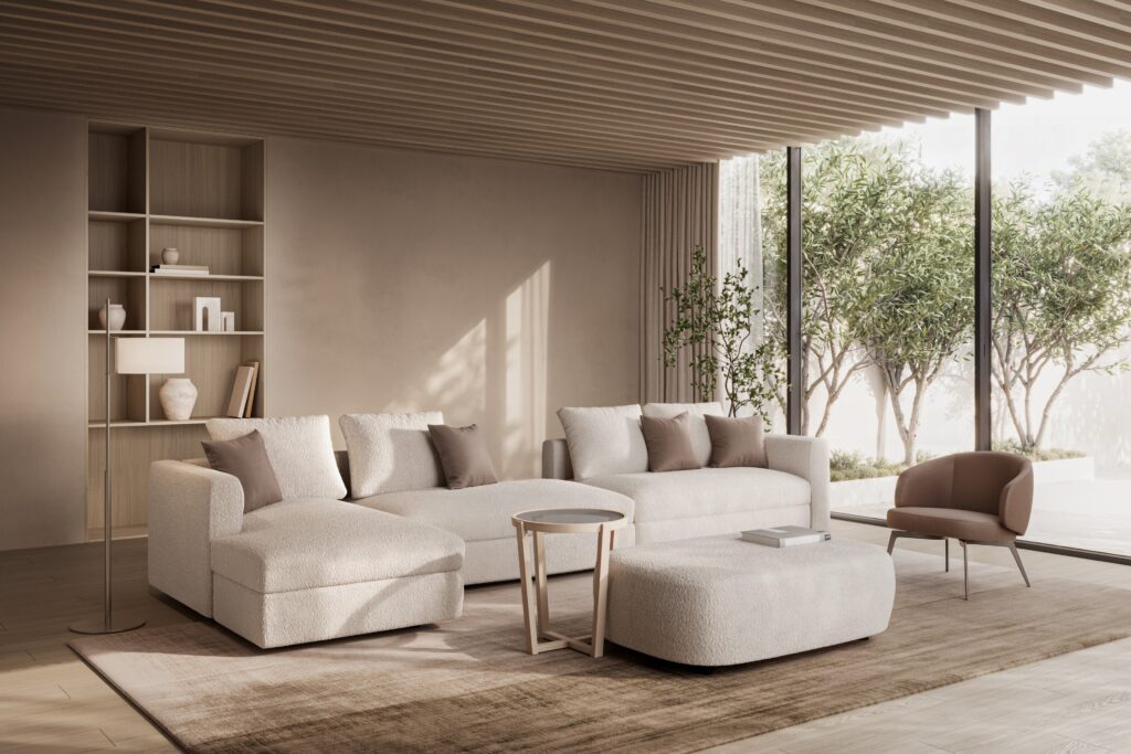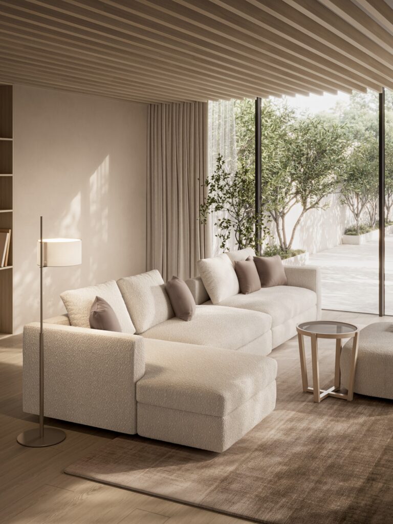 鳥が大空に翼を広げたような、美しい広がりを感じさせるシステムソファです。ストレートやカウチ型のみならず、ゆるやかな角度でレイアウト展開できるモジュールになっています。座る角度や方向も自由で思い思いにくつろぐことができ、新たなつながりをもたらす場所が生まれます。